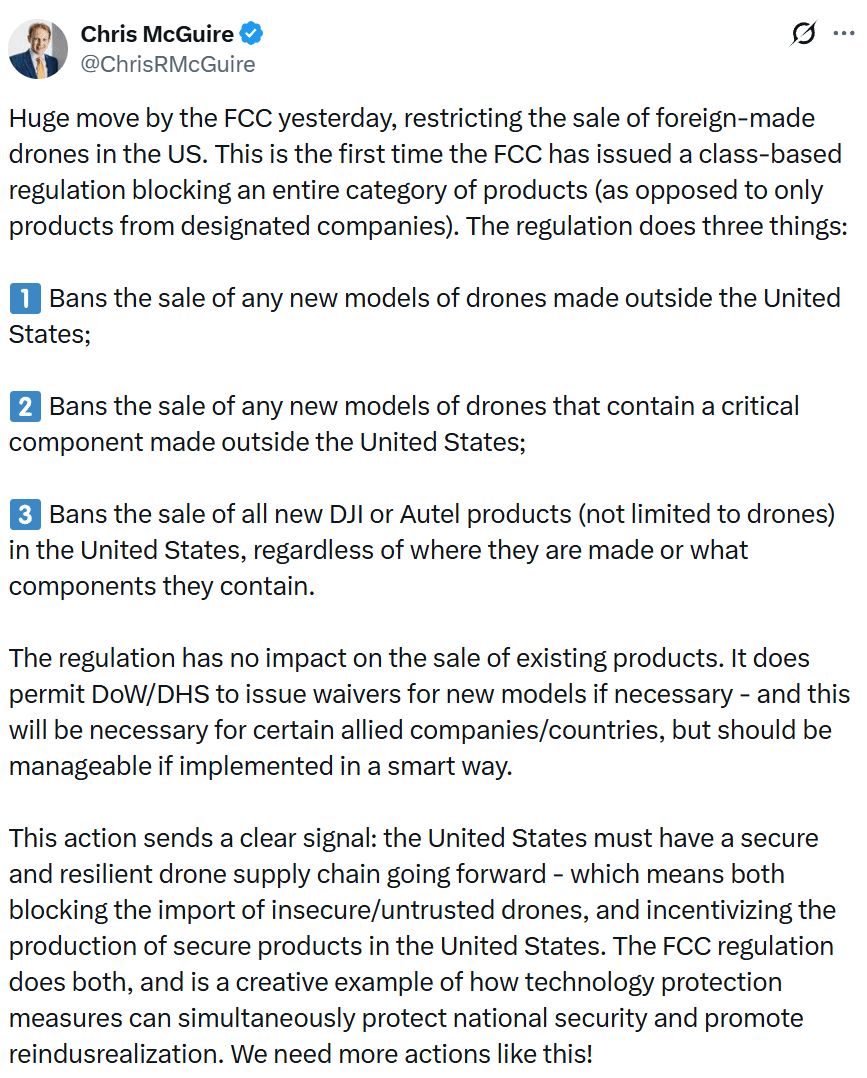 In the post, Keith Rabois highlights a significant regulatory action taken by the Federal Communications Commission (FCC) that impacts the sale of foreign-made drones in the United States. Rabois notes that this marks a historical precedent as it is the first instance where the FCC has imposed a class-based regulation that broadly targets an entire category of products rather than individual companies. This action stems from a national security determination and reflects rising tensions around foreign technology and its implications for domestic security. The FCC added foreign-produced Unmanned Aircraft Systems (UAS) and critical components to a 'Covered List,' which restricts their availability in the U.S. market, signifying a shift in regulatory practices aimed at safeguarding national interests.